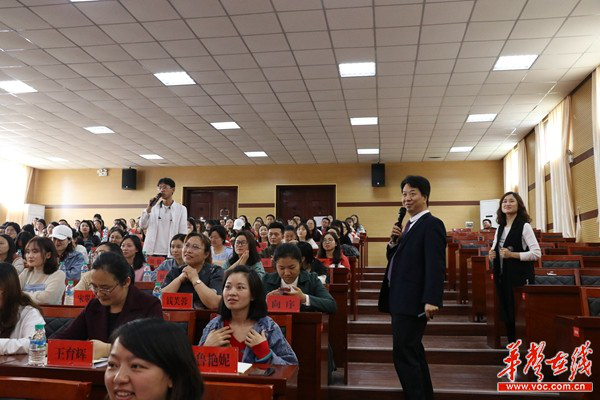 23日,在龙山县教体局讲座现场,来自全县各乡镇的150余名中小学教师代表聆听了讲座。学员中年纪最大的超过40岁,最小的才刚满20岁。不少学员已经提前在爱课程网(中国大学MOOC)学习过省级精品在线开放课程《广播节目播音主持》,这次能与主讲老师荣斌面对面交流,喜悦的心情洋溢在脸上。