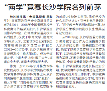 长沙晚报讯(全媒体记者周和平)中国高等教育学会专家组日前公布的《2014—2018年全国普通高校学科竞赛评估结果》显示,长沙学院全国排名218位,在湖南省普通高校中名列前茅,仅次于中南大学、湖南大学等8所大学。之前该学会发布的《全国高校教师教学竞赛分析报告(2012—2017)》中,长沙学院在湖南省普通高校中排名第6位,仅次于湖南大学、中南大学、长沙理工大学、湖南农业大学、南华大学等5所大学。