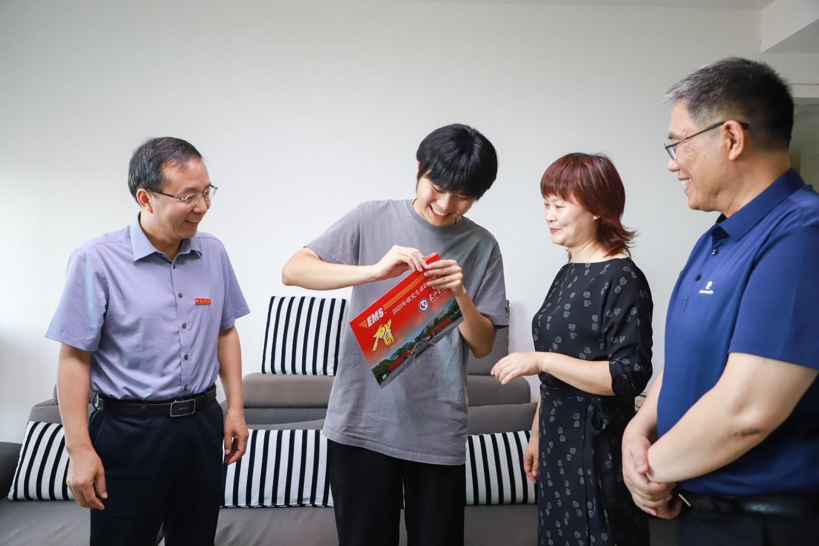 “恭喜你被长沙学院录取!”7月4日上午,长沙学院校长陈赤平携党政办、研究生学院、马栏山新媒体学院负责人来到长沙市雨花区湘水一城小区,将学校首封硕士研究生录取通知书送到新生李宁康手中。