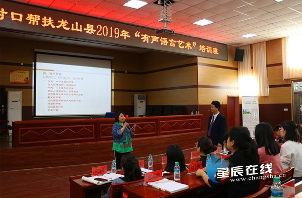 这是来自长沙学院的教学团队三天来在龙山开展的第五场有声语言培训讲座。“扶贫先扶智,扶智先通语”。2018年以来,随着《推普脱贫攻坚行动计划(2018—2020年)》发布,我国语言文字工作与国家脱贫攻坚战略实现全面对接,语言脱贫攻坚战正式打响。发挥不同语言在不同场合的作用,使得各种语言能各得其所、各展所长,助力贫困人口实现脱贫,成为当前一段时期扶贫工作的重要内容。龙山县是长沙市对口帮扶单位,龙山县大安乡是长沙学院对口扶贫点。为提高龙山县中小学师生、村干部及村民的有声语言表达能力,湖南省播音主持研究会常务理事、长沙学院影视艺术与文化传播学院副院长、硕士生导师、主任播音员荣斌率教学团队赶赴龙山,先后在县教体局、大安乡、乌鸦九年制学校、惹巴拉景区等地举行讲座,将其所负责的省级精品在线开放课程《广播节目播音主持》送到学员眼前,面对面推广普通话,传播有声语言艺术。