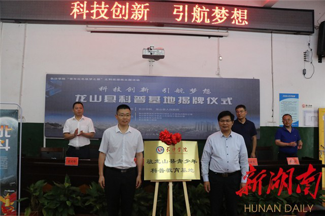 这支12人的博士团队包含了地理学、生物学、环境科学、化学、通信工程等学科和专业的多名教授及博士。在龙山二中,通信专家吴鹏就为同学们开展了一场题为“北斗卫星导航系统及其应用”的学术讲座,还演示了相关设备,受到同学们热捧,大家纷纷举手参与讲座互动。现场,刘沛林和龙山县委副书记陈忠耀共同为长沙学院驻龙山县青少年科普教育基地揭牌。“长沙学院将充分发挥高校的优质资源,有计划有组织地每年安排科普志愿者来龙山开展一些科普讲座活动,提高青少年的创新能力,把好事办好、实事办实。”刘沛林表示。