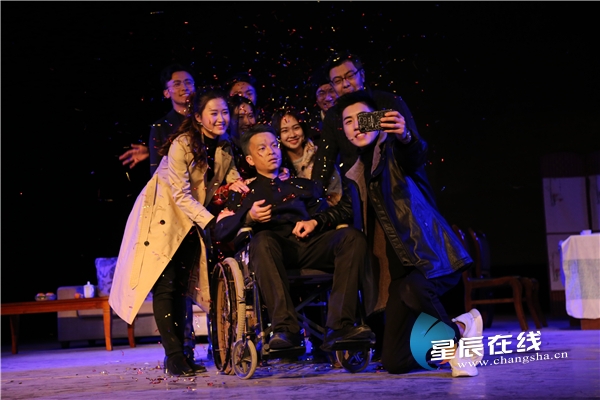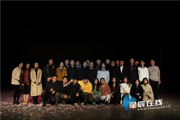 (12月16日晚,长沙学院影视艺术与文化传播学院老师荣斌指导的话剧《时间都去哪儿了》和《一口唾沫一个钉》在芙蓉国剧场进行了专场公演。)