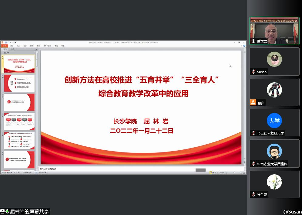 我们创新并完善了思想引领、工作协同、教育教学改革、典型示范、文化浸润、持续改进六大机制,重点建设‘三全育人’十大工程,打造出一系列特色和亮点工程,形成了可持续推广的经验。”1月22日,受学校党委书记杨小云教授委托,教育部创新方法教指委副主任委员、长沙学院原党委副书记屈林岩教授在教育部高等学校创新方法教学指导分委员会召开的2021年度年会上向来自全国各地的专家学者介绍长沙学院在推进“五育并举”“三全育人”综合教育教学改革的创新举措。