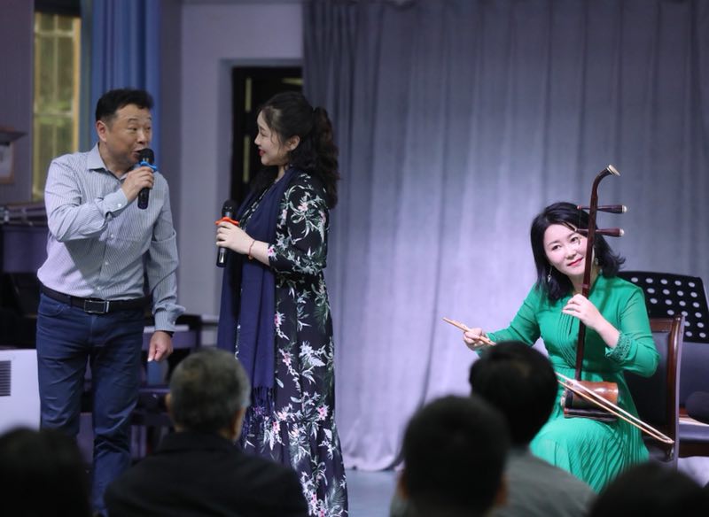 在随后的环节,中国戏曲表演艺术最高奖“梅花奖”得主叶红登台,在王勇的伴奏下精彩“开唱”,其专业的表演引来台下阵阵掌声。叶红带来的《洗菜心》颇受青睐,台下的一位学生幸运地走上舞台,跟随老师们现场学习,并表示受益匪浅。讲座最后,一曲《刘海砍樵》的经典唱段《比古调》惊艳现场。王勇、叶红联袂表演,蔡霞担任大筒伴奏,将整场讲座推向高潮。