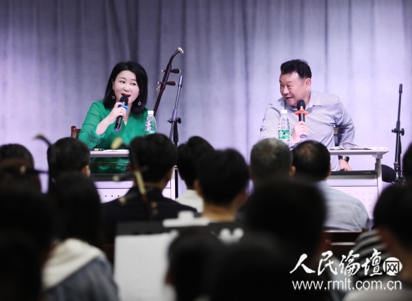 本期讲座,蔡霞可谓“推陈出新”,特别邀请国家一级演奏员、湖南省戏曲音乐协会副会长王勇、中国戏曲表演艺术最高奖“梅花奖”得主叶红加入。在讲座过程中,蔡霞、王勇联袂主讲,针对大筒的艺术特征、演奏技巧等方面进行示范教学。两人配合默契,讲述、哼唱、演奏……讲座形式丰富,无论是“大筒艺术特征”和“大筒演奏法”的归纳解析,还是花鼓戏小调《洗菜心》和《瓜子红》的现场示范,两人都一丝不苟,用心、用脑、用情与听众沟通交流,有效地将大筒艺术的知识普及、兴趣引导与技能传授和谐融为一体。