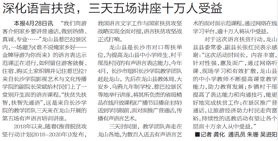 龙山县是长沙市对口帮扶单位,为提高龙山县中小学师生、村干部及村民的有声语言表达能力。今年4月,长沙市组织长沙学院教学团队赶赴龙山,先后在龙山县教体局、大安乡、乌鸦九年制学校、惹巴拉景区等地举行讲座,将其所负责的省级精品在线开放课程《广播节目播音主持》送到学员眼前,面对面推广普通话,传播有声语言艺术。