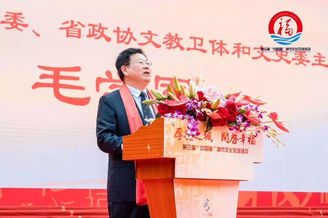 国内外福文化研究专家、学者和来自全国“福”文化城市联盟的嘉宾代表齐聚一堂共论福文化,长沙市开福区 “身边好人”、道德模范、群众代表出席活动。开幕式上,中共开福区委副书记、区长刘拥兵致欢迎辞,中国福文化研究专家省政协文教卫体和文史委主任毛学军作精彩发言,中共开福区委副书记谢伟峰做开福区城市推介。