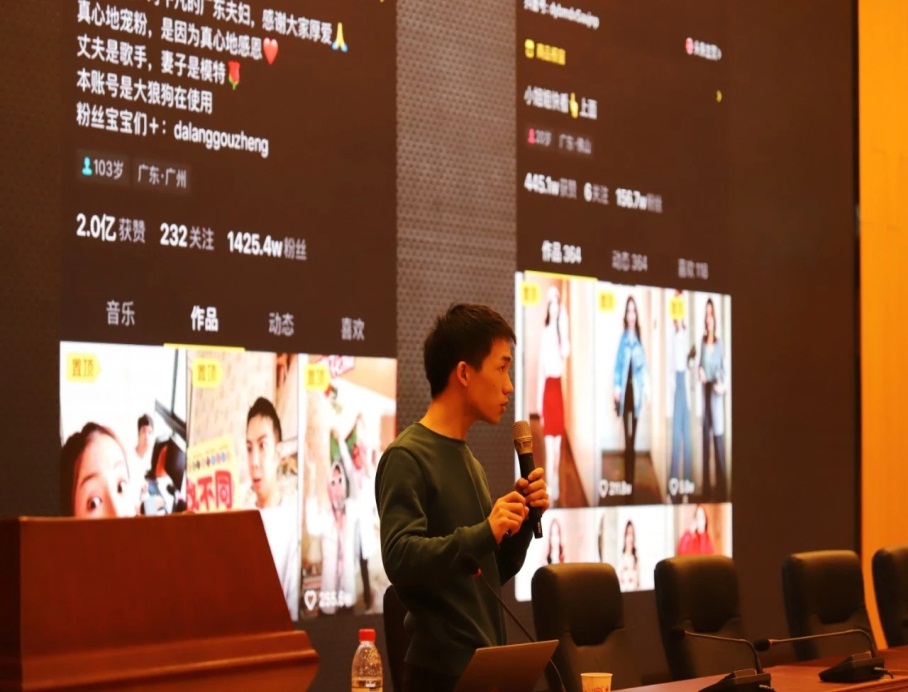 在课程首日的开班典礼结束后,浙江传媒学院李新祥教授率先为大家解析了新视听产业的发展趋势及应对策略,通过解析抖音平台流量机制及美颜、美妆、职场、游戏等各个领域的热门案例,结合热门视频的标题、封面、拍摄技巧等方面,详细讲解了如何打造一个深入人心的IP并进行有效的推广。