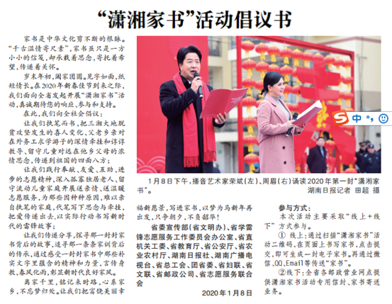岁末年初,阖家团圆。见字如面,纸短情长。在2020年新春佳节到来之际,我们面向全省发起开展“潇湘家书”活动,真诚期待您的响应、参与和支持。