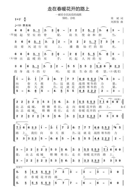 这是一次含着热泪的创作,这是一场“云”技术支撑的创作。响应防疫号召,作词(荣斌)、作曲(刘淮保)、演唱(长沙学院音乐学院的谢萍、刘丹、伍珊妮、易洁,湖南省歌舞剧团的李琛和湖南省音乐家协会男高音联盟的黄新平、贺继、安永明、周小勇、彭沛、柳通等)在“云”端充着电、熬着夜,多次进行认真讨论后精心创作,并特别进行了“云”监棚、录制和演唱,长沙学院影视艺术与文化传播学院制作完成这首短小精悍、铿锵有力的抗“疫”战歌——《走在春暖花开的路上》。将这2分43秒的感动,献给万众一心、同舟共济的“全民抗疫战”,向所有为我们拼过命的抗“疫”英雄们致敬!