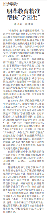 “小朱同学,记得进课堂听课哦。”在这个全民网课的假期里,长沙学院生物与环境工程学院2018级功能材料专业的雷恬还有一项特殊的任务,就是在网上督促并帮助自己的帮扶对象朱同学(化名)认真落实学习计划。朱同学大一两个学期累计5门功课不及格,为了帮助他,学院安排了同班学习成绩好的雷恬和他结成对子,实施一对一精准帮扶。