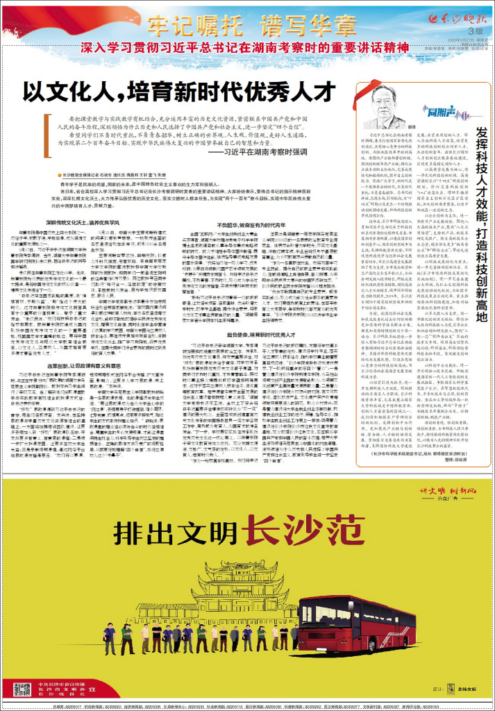 连日来,省会高校深入学习贯彻习近平总书记在长沙考察调研时发表的重要讲话精神。大家纷纷表示,要将总书记的指示精神落到实处,深深扎根文化沃土,大力传承弘扬优秀的历史文化。落实立德树人根本任务,为实现“两个一百年”奋斗目标、实现中华民族伟大复兴的中国梦培育人才、贡献力量。