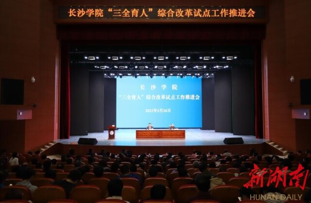 作为湖南省第二批“三全育人”综合改革试点高校,长沙学院2021年拟用“五育并举”教学改革工程、部校共建马克思主义学院工程、课程思政教学改革创新工程、学科竞赛与科技创新育人工程等十大重点建设工程全面推进学校“三全育人”工作。会上,该校党委副书记屈林岩部署了“三全育人”十大重点工程相关工作。校党委书记刘沛林要求大家,提高政治站位,充分认识新时代“三全育人”综合改革的重大意义;坚持守正创新,全面统筹谋划新时代“三全育人”工作的新格局;培育特色品牌,着力打造新时代“三全育人”工作的亮丽名片。