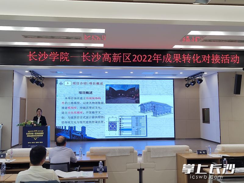 现场,6个项目进行了路演,这些项目紧密围绕工程机械、生物医药、环境治理、航空航天等长沙22条产业链当中的重点领域,突出科技成果的技术性、创新性、实用性。其中,长沙学院土木工程学院常锦博士团队展示了将固体废弃物“钢渣”进行资源化再生利用的研发成果,能够替代道路工程中的“水泥”材料,节省20~25%材料费用。该院人文地理与城乡规划专业大二学生谢珺颖所在团队,路演了“湖湘传统建筑装饰构件的数字化保护与创意设计”项目,引发与会专家关注。这一由大一大二学生组成的创业团队,目标建立和完善传统建筑构件的物理模型数据库及文化资源库,对传统建筑物进行保护与数字再创作,用自己的专业知识传承传统建筑背后的文化自信。