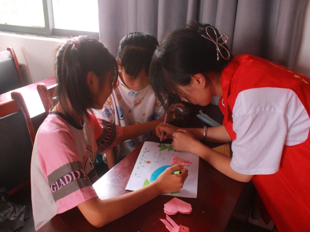 实践团与孩子们一起画防溺水安全手抄报