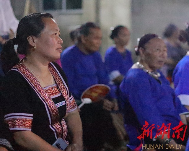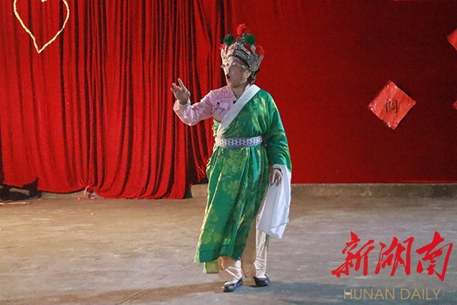 期间,侗戏非遗传承人——龙登娥老师也赶赴现场,以一首侗戏深入侗乡民众内心。“锵啷啷,锵啷啷......”一阵热闹的锣鼓中,龙登娥身着戏服,和着伴奏乐器的二胡声出场,一颦一笑,一举一动中,都是那么的传神。现场的侗族老人说:“这是我们以前爱看的,一场精彩的侗戏表演出来不容易,我们爱看侗戏,龙老师的侗戏好看得很......”联欢会现场,传统文化与现代文化交相辉映,村民们感受到了一场侗乡特别的“村晚”,纷纷给表演者特别是长沙学院的学生们点赞。