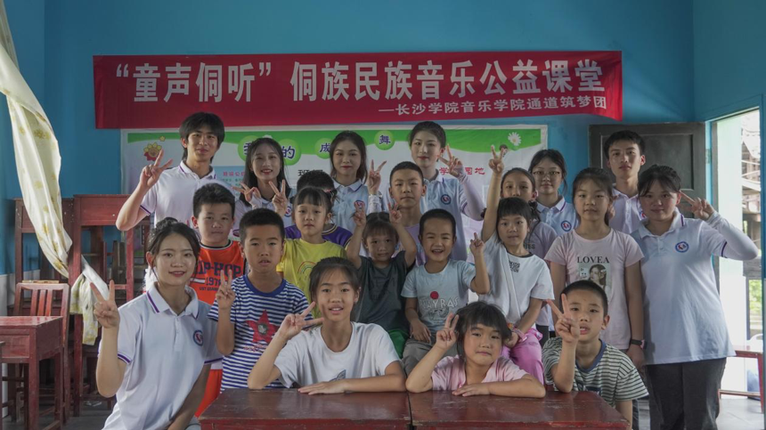 厚植侗乡沃土,赋能乡村振兴。长沙学院音乐学院通道筑梦团利用专业优势,结合民族文化特色,深耕非遗文化,播撒教育种子。五年来,团队担使命、践初心,足迹遍及通道侗族自治县9个乡镇、14个村寨,与坪坦乡、双江镇共6个村落共建实践教育基地,不断探索村校共育的新路径,以非遗之光,助推民族音乐文化普育传承及少数民族地区乡村文化振兴。该团队相继荣获共青团中央“镜头中的三下乡”“优秀摄影团队”、湖南省第五届“雷锋杯”志愿服务大赛金奖,荣获湖南省第十六届“芙蓉学子·榜样力量”社会实践奖,多次荣获湖南省大中专学生志愿者暑期文化科技卫生“三下乡”社会实践优秀团队。