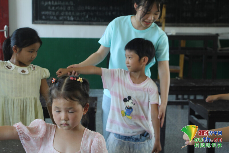 图为团队成员指导学生啦啦操动作 中国青年通讯员蒲原佳兰摄