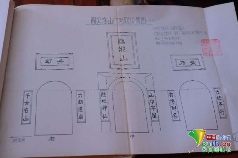 图为资料记载的陶公庙山门对联位置图。中国青年网 李家琪 摄