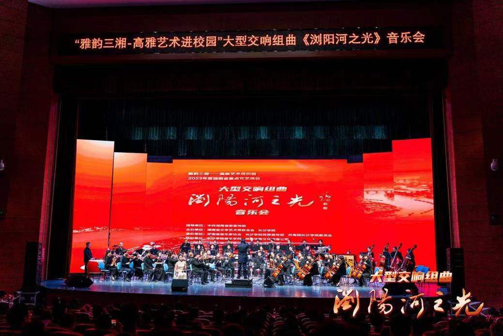 4月26日晚,《浏阳河之光》在长沙学院学生活动中心开启巡演第一场。本场音乐会在湖南省委宣传部指导下,由湖南省文联与长沙学院共同主办,湖南省音协与长沙学院宣传部、长沙学院团委共同承办,由湖南湘江交响乐团担任演奏。