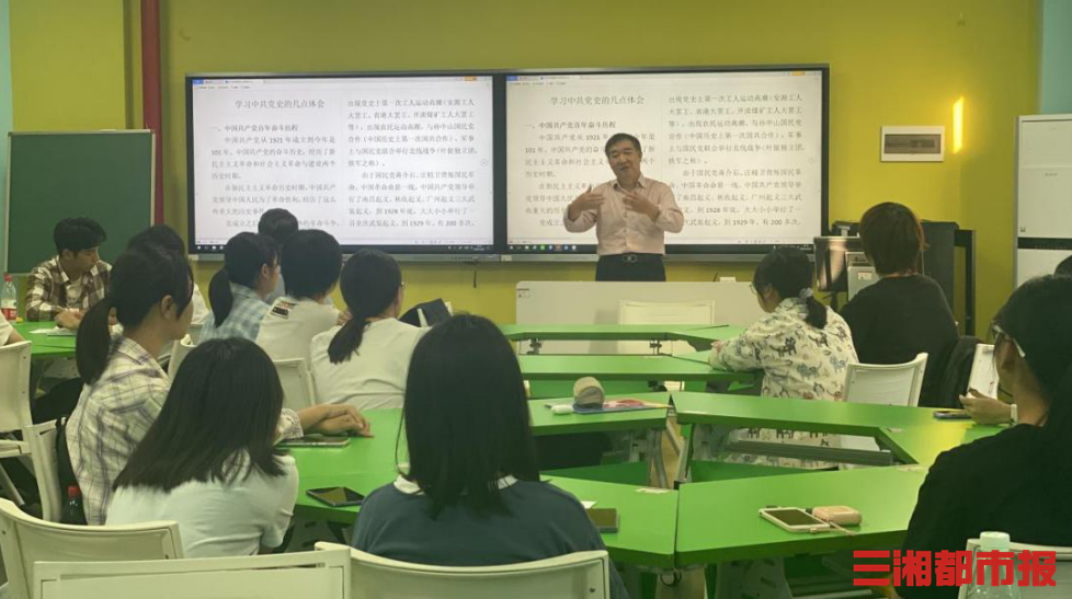 涵虚楼智慧教室内,长沙学院关工委副主任戴开柱教授正为22级法学2班的同学们讲授党课。他以党在成立之初发生的革命事件引入,阐释了党的百年奋斗历程,解答了学生的困惑,并在互动环节中与同学们开展热烈的学习研讨。