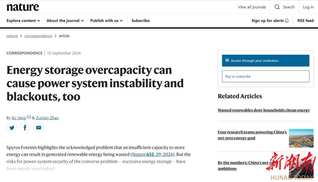 9月10日,国际顶级期刊《Nature》Correspondence栏目在线发表了长沙学院电子信息与电气工程学院杨波教授的评论文章《Energy storage overcapacity can cause power system instability and blackouts,too》,这是该校首次作为第一完成单位、学校教师为第一作者和通讯作者在《Nature》正刊上发表文章,实现重大突破。