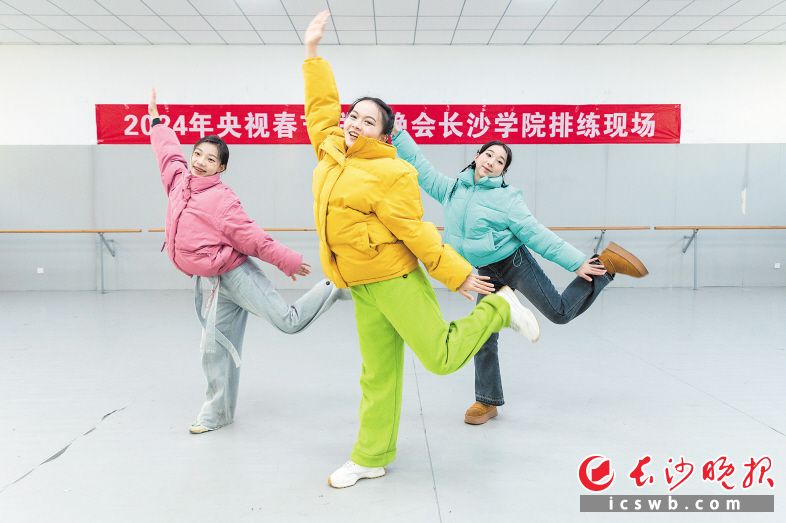 长沙学院舞蹈生周玎(中)、肖雅源(图左)、颜可佳(图右)排练2024央视春节联欢晚会长沙分会场节目 。长沙晚报全媒体记者 董阳 摄