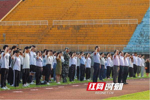 红网时刻长沙9月18日讯(通讯员 梁莉 摄影 谢雨彤 金帼 徐梓洋) “铭记历史,弘扬爱国精神,为实现伟大中国梦,矢志不渝,奋发图强!”“祖国交给我们来保护!”9月18日清晨,面向朝阳和国旗,长沙学院5000余师生在天健体育场举行特别主题团日活动,用青春和誓言向在“九一八”事变中的死难同胞致敬,向祖国宣誓。
