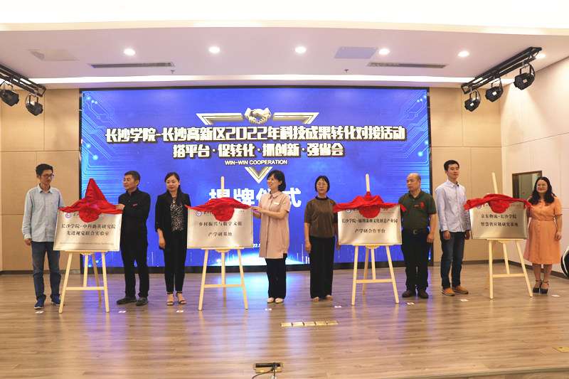 本次对接会上,长沙学院和长沙高新区代表共同为“长沙学院-长沙高新区共建岳麓山国家大学科技园科技成果转化基地”授牌,长沙学院有关二级学院代表与园区企业共同为“长沙学院-中科助英智能科技研究院先进视觉联合实验室”“长沙学院-中合慧景乡村振兴与数字文旅产学研基地”“长沙学院-锦绣潇湘文化创意产业园产学研合作平台”“京东物流-长沙学院智慧供应链研究基地”揭牌。
