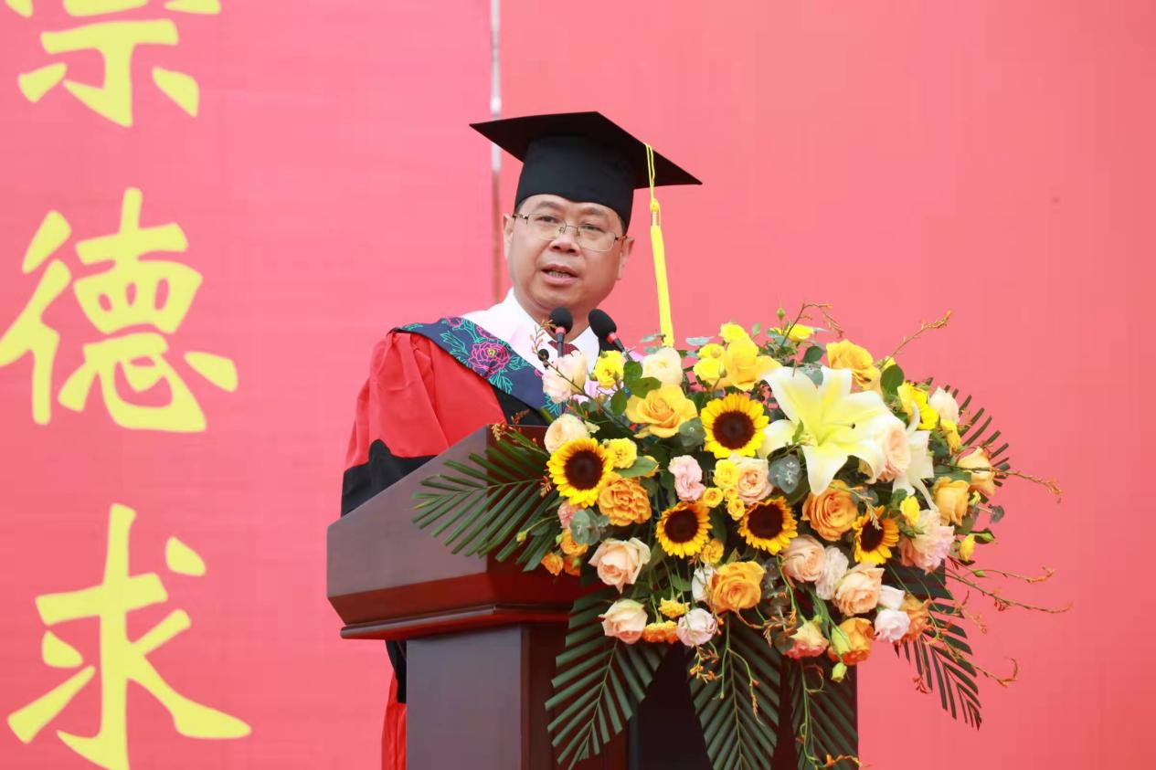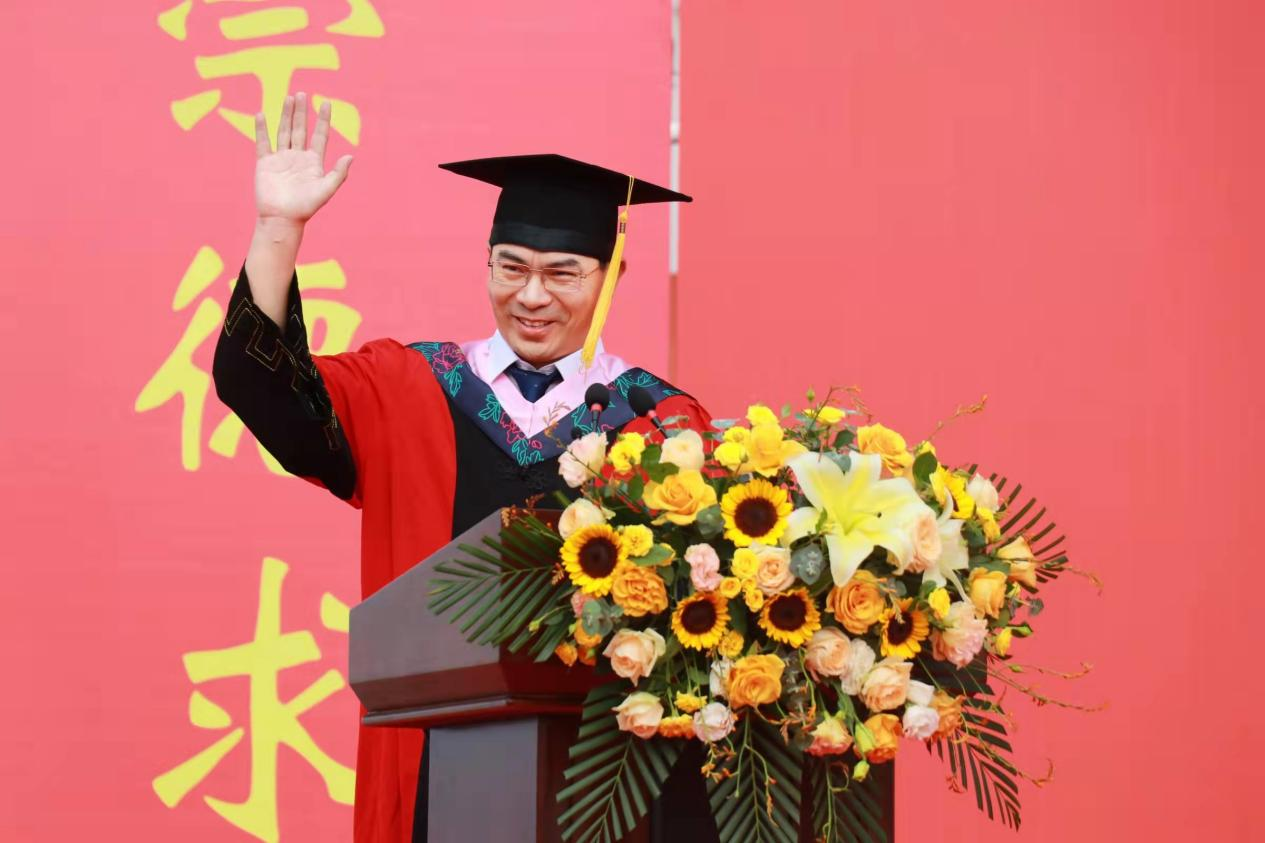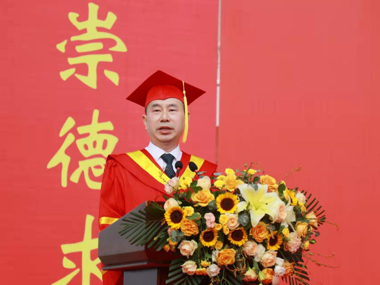 典礼在雄壮的国歌声中拉开帷幕。党委副书记、校长黄立宏在致辞中代表学校向毕业生送上美好祝愿。“孟夏草木长”,在这充满生机活力的季节,黄立宏勉励广大毕业生胸怀远大、勇毅前行,在未来的人生道路上不断完善自我,希望毕业生自信地走向人生的新阶段,坚持弘扬“崇德求真,实干担当”的长大精神,用脚步丈量祖国大地,用眼睛发现中国精神,用耳朵倾听人民呼声,用内心感应时代脉搏,把个人梦、家庭梦和国家梦、民族梦结合起来,把自己的事业、自己的奋斗和服务国家、服务社会、服务人民结合起来,努力成为中华民族伟大复兴中国梦的建设者、推动者和圆梦者,在新征程中书写更精彩的人生华章。