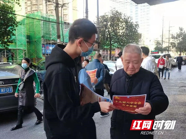 在富雅坪社区的主干街道、商铺以及部分住宅,团队成员将事先制作好的宣传单发放给市民,耐心宣讲全会精神。在蒋家垅社区公共服务中心,学生党员王玉兰从“会议的意义与背景”“公报的内容”和“关键的表述与亮点”三个方面,向市民宣讲了党的十九届六中全会精神。