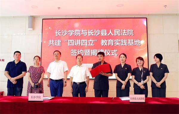 2021年7月8日下午,长沙学院与长沙县人民法院共建“四讲四立”教育实践基地签约揭牌仪式在长沙县法院举行。长沙学院关工委常务副主任杨兴龙,长沙县法院党组书记、院长丁念红代表双方签署合作共建协议,并共同为长沙学院“四讲四立”教育实践基地揭牌。