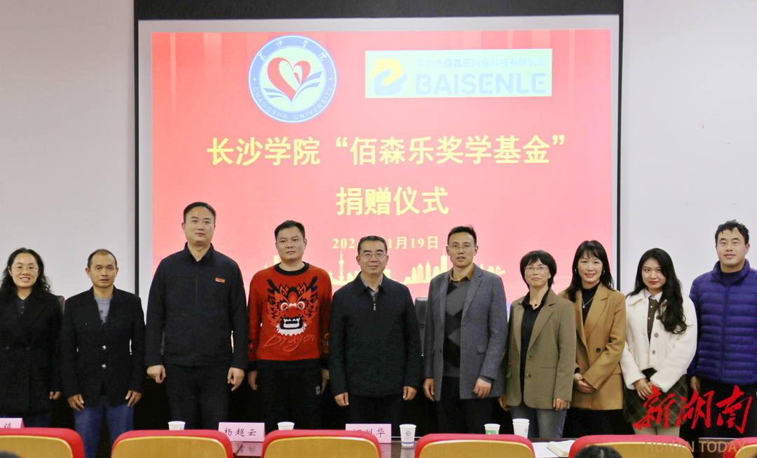 11月19日下午,长沙学院“佰森乐奖学基金”捐赠仪式在学校长智楼C501会议室举行。外国语学院2012届毕业生,深圳市佰森乐网络科技有限公司创始人、总经理杨超云校友再次向母校捐赠15万元并设立“佰森乐奖学基金”。长沙学院党委委员、副校长何利华出席捐赠仪式并为杨超云颁发“优秀校友”荣誉证书。