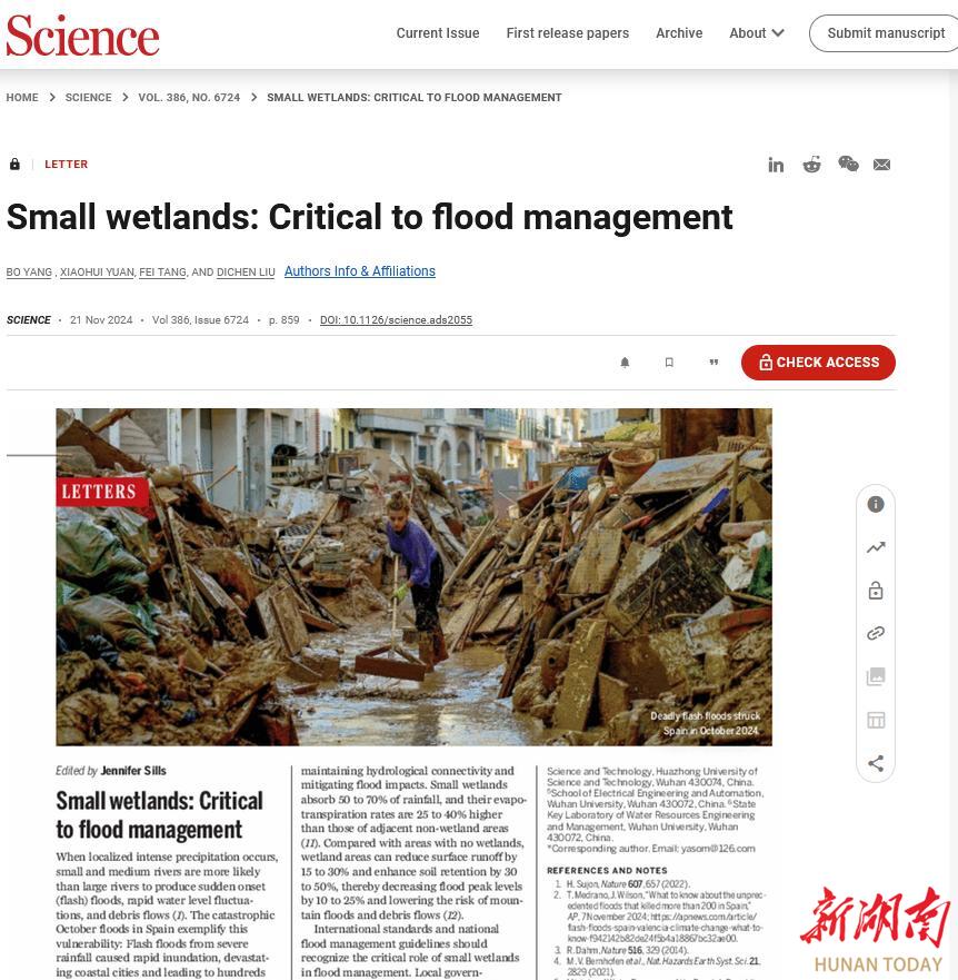 11月22日,长沙学院电子信息与电气工程学院杨波教授团队在国际顶级学术期刊《Science》上发表题为《Small wetlands: Critical to flood management》的Letters文章。文章以杨波教授为第一作者和通信作者,长沙学院为第一署名单位,华中科技大学和武汉大学为共同合作单位,并被选为同期Letters封面。该研究成果的发表,是杨波教授继今年9月在《Nature》上发表文章后的又一标志性成果。