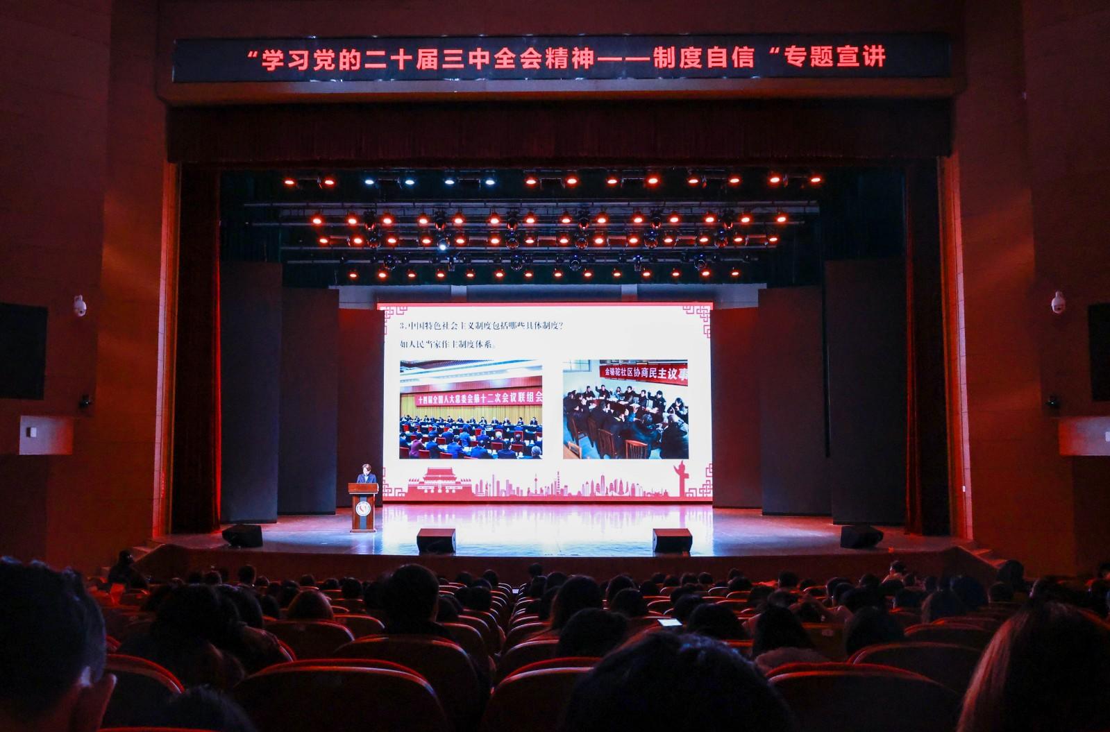 说党课、唱红歌、诵祖国、演话剧……11月26日下午,长沙学院马克思主义学院承办的“学习党的二十届三中全会精神——制度自信”专题宣讲会暨“读史、讲故事、立信”主题活动经典荐读导读会在学校学生活动中心举行,师生们通过说唱诵演,生动再现历史场景,创新高校思政教育形式,给现场800余名师生带来了一场沉浸式思政“金课”。