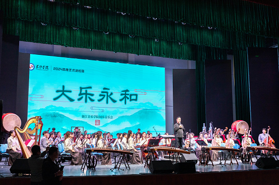 古筝清脆琵琶切切,古琴悠扬竹笛婉转。暖冬之夜,年轻的国乐手们倾情演绎国乐大曲,余音绕梁,长沙学院学生活动中心里掌声不绝于耳。11月29日晚,由教育部、财政部、文化和旅游部主办,省教育厅、浙江音乐学院和长沙学院承办的湖南省“高雅艺术进校园”系列活动——国乐音乐会《大乐永和》在长沙学院学生活动中心惊艳亮相,为学校上千余名师生观众带来了7首具有中华文化底蕴、浙江地域特色、多元演奏类型的民族乐作品,呈现了一场国乐大曲和经典曲目的精彩演绎。