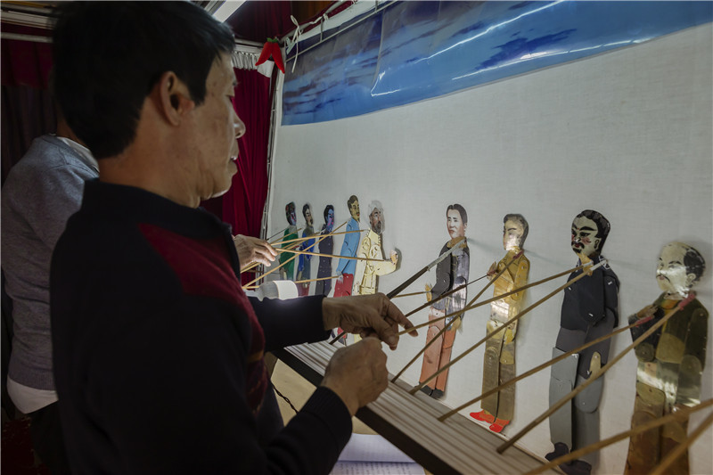 湖南省首批省级非物质文化遗产项目传承人、第十七代皮影戏传承人王冬林正在唱皮影戏。 颜益平 摄