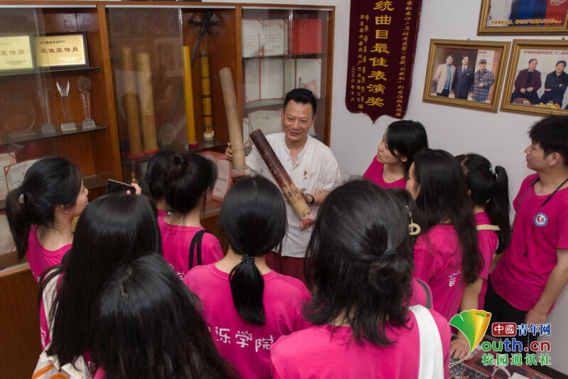 图为实践团来到祁东渔鼓传承基地走访,非遗传承人邹昆山老师结合自身研究成果与从艺经历,生动地向大家介绍了渔鼓文化的起源与发展。中国青年网通讯员 陈鑫 摄