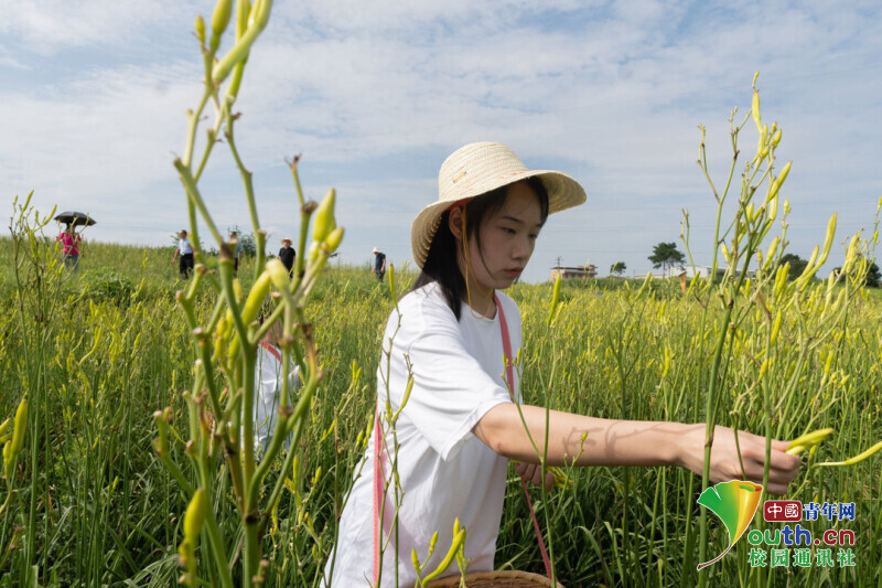 图为实践团受祁东县委组织部邀约,实践团前往黄花菜古法加工工艺非遗传承基地进行参观学习,成员为了更好地践行祁东县委人才办“将假期活动打造成社会实践大课堂”的宗旨、在劳动教育中了解黄花菜文化,下田地体验人工采摘黄花菜,了解黄花菜采摘经验、感受菜农劳动的艰辛。中国青年网通讯员 陈鑫 摄