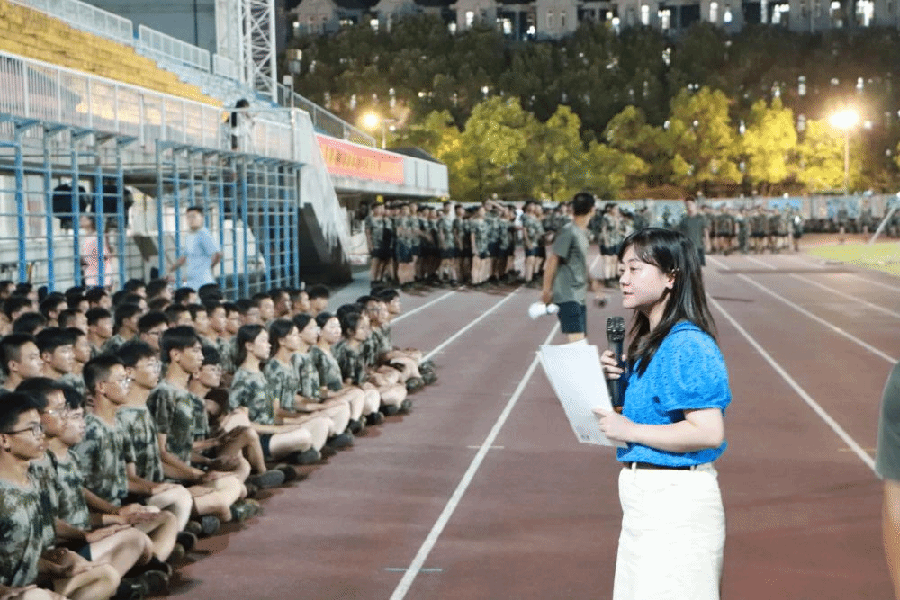 电信学院党总支副书记江艳动员正在军训的同学们写下对大学四年的期许 倪俊杰/摄