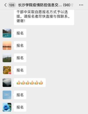 1月30日,学校防疫防控信息交流工作群中发出通知,为进一步加强学校所在的洪山街道疫情防控工作,充实社区一线防控力量,征集部分党员干部志愿者对口援助洪山街道。“我报名”“报名”,通知发出后不到20分钟,30多位志愿者即集结成功。半个小时后,还不断有后续的报名者,希望能在疫情防控阻击战中尽一份力量:“下一阶段有需要记得安排我,我随时待命。”