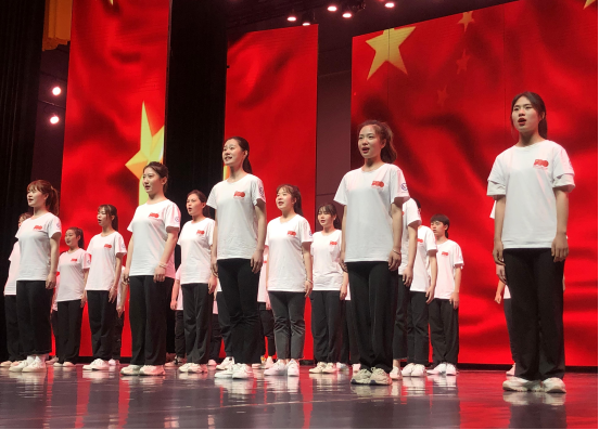 荣获2021年全国第六届大学生艺术展演金奖的原创舞蹈《十八洞的新苗歌》,生动反映了湖南脱贫攻坚成果。走位灵巧,裙摆蹁跹,小小的竹背篓在舞蹈演员的手中被融入舞蹈动作与故事,为富有创意的舞蹈设计增添一抹亮色。最后,一曲激情高昂的《我和我的祖国》合唱为这堂音乐党史课拉下帷幕。
