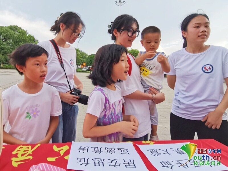 图为暑假社会实践团队成员与小朋友进行防溺水知识游戏问答。中国青年网通讯员 胡丹 摄