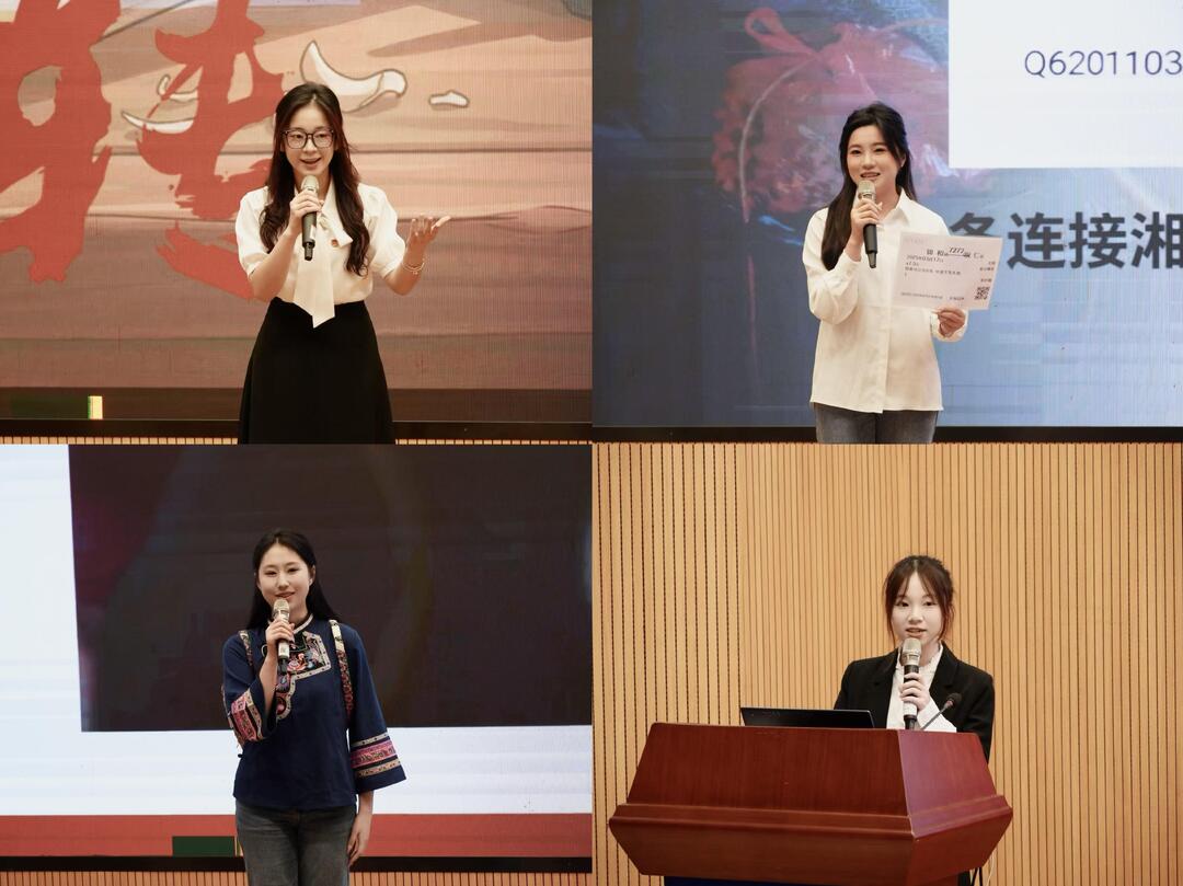 宣讲台上,青春之声铿锵有力。来自马克思主义学院的蔡慈晔小组以一支见证千年文脉的岳麓书院毛笔为独特叙事视角,描绘了新时代青年扎根基层、投身志愿服务,在文脉传承中践行爱国初心的青春答卷;马栏山新媒体学院陈柄宇小组采用跨时空对话形式,情景演绎第28届中国青年五四奖章获得者朱霞与李贞将军跨越时空的相遇,深情诠释长征精神的当代传承,展现湘女扎根基层、实干为民的红色接力与青春责任;学生组织推荐的陈映妤小组从湘西 “背篓专线” 慢火车与乡土民俗切入,在高铁 “中国速度” 与慢车 “民生温度” 的鲜明对比中,深刻彰显国家发展快慢同行、枝叶关情的民生初心与大国担当。