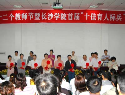 9月8日下午,科技楼学术报告厅掌声不断,庆祝第二十二个教师节暨2006年度我院“十佳育人标兵”表彰大会隆重启幕,来自教学、管理、服务等岗位的十位“十佳育人标兵”接受了学校的表彰。刘耘院长主持了大会,李咏芳书记作了讲话,副书记、副院长李云龙宣读了“十佳育人标兵”的表彰决定,副院长钟惠英、纪委书记胡名健、院长助理刘世昌出席了大会。李书记代表学校党委、行政向荣获2006年度“十佳育人标兵”称号的同志表示热烈的祝贺,向为学校发展建设辛勤耕耘的全院教职员工表示亲切的慰问。全院教职员工欢聚一场,共同庆祝自己的节日。