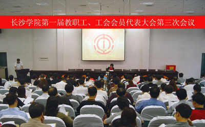 10月14日,我校第一届教职工、工会会员代表大会第三次会议在科技楼学术报告厅举行。大会审议并通过了《长沙学院“十一五”事业发展规划》和《长沙学院校内劳动分配方案》。65位正式代表、44位列席代表和10位特邀代表参加了会议,出席会议的校领导有李咏芳、刘耘、李云龙、钟惠英、胡名健、熊国章、方逵、刘世昌。副院长钟惠英主持会议,副书记、副院长李云龙作了《关于修订〈长沙学院校内劳动分配方案〉》的报告,党办(院办)主任周明侠就《长沙学院“十一五”事业发展规划》的制定作了说明。