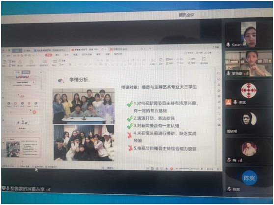 本次活动分为两个阶段,首先进行的是课程思政院级选拔赛。按照赛前视频抽签的顺序,播音与主持艺术专业的黎鲁蒙老师、广播电视编导专业的梁湘梓老师、新闻学专业的朱珊老师、影视摄影与制作专业的曾雨欣老师、汉语言文学专业的谭真明老师、影视摄影与制作专业的王银洁老师依次进行了10分钟现场说课、5 分钟课堂教学展示和5 分钟现场答辩。评委根据选手的课堂教学设计和现场表现在线进行了评审,其中黎鲁蒙、梁湘梓、曾雨欣荣获一等奖代表学院参加学校比赛,朱珊、王银洁荣获二等奖,谭真明荣获特别奖。赛课之后,各教研室结合本次选拔赛,围绕“如何实施春风化雨育人无声的课程思政和提高在线教学质量”分别开展了云端研讨活动。