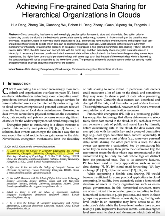 近日,我校计算机工程与应用数学学院邓桦副研究员以第一作者身份在国际期刊《IEEE Transactions on Dependable and Secure Computing》(简称TDSC)在线发表论文“Achieving Fine-grained Data Sharing for Hierarchical Organizations in Clouds”(文章DOI号:10.1109/TDSC.2022.3153467),长沙学院为第一单位。TDSC属于中国计算机学会推荐A类(CCF-A)类期刊,影响因子7.329,是网络空间安全领域国际顶级期刊。本论文的发表标志着我校在网络空间安全学术领域取得了新的突破。
