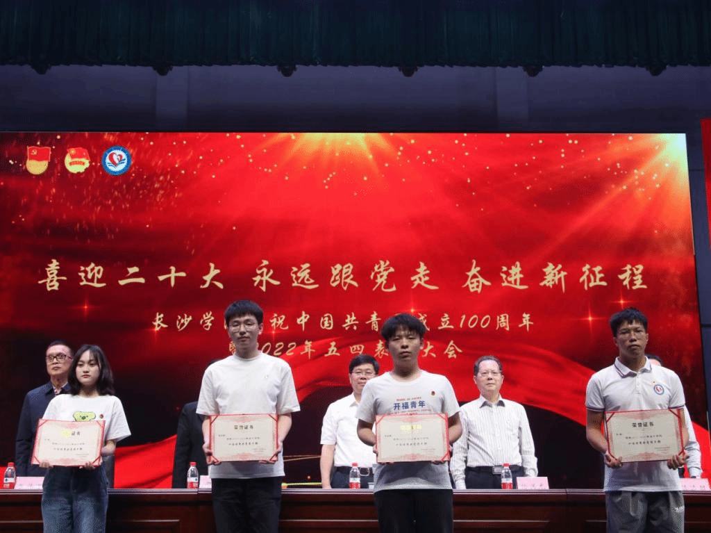 大会表彰了长沙市五四红旗团总支、长沙学院2021年度五四红旗团总支、五四红旗团支部、优秀共青团干、团员、暑期三下乡社会实践、优秀志愿服务集体、志愿者及五星级社团。生环学院林涵、马栏山新媒体学院游洁敏和法学院陈骐先后作为五四红旗团总支书记代表、十佳优秀共青团干部代表和优秀志愿者代表上台发言。
