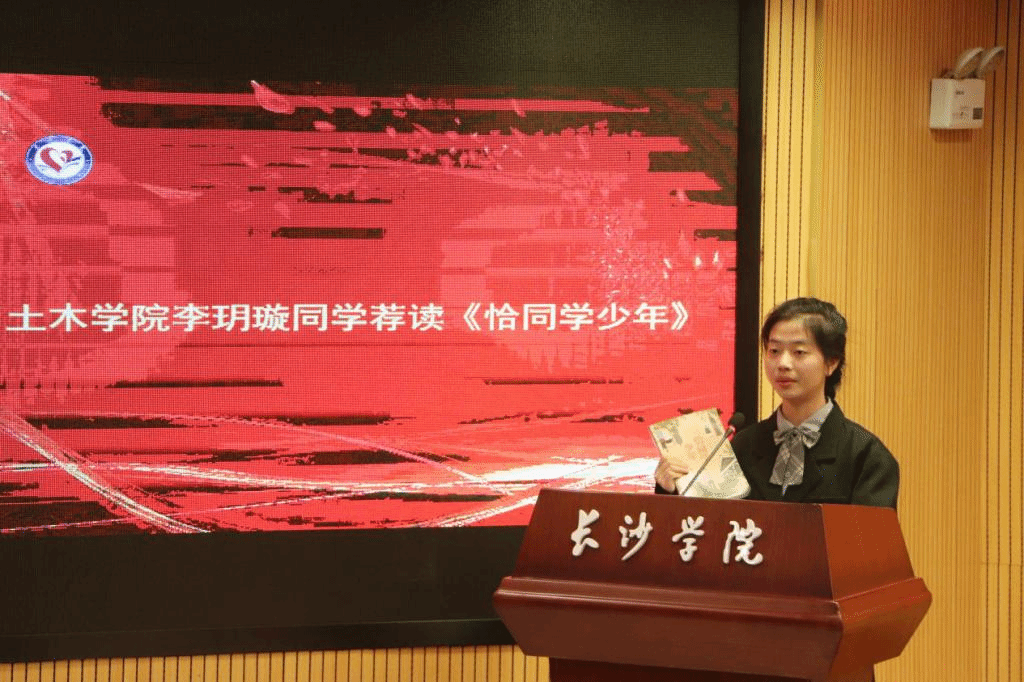 土木学院的李玥璇同学荐读了《恰同学少年》一书,她栩栩如生地描述书中毛泽东专注认真、乐于助人、以天下为己任的形象,以及她读完书后“修学储能,先博后渊”的感悟。
